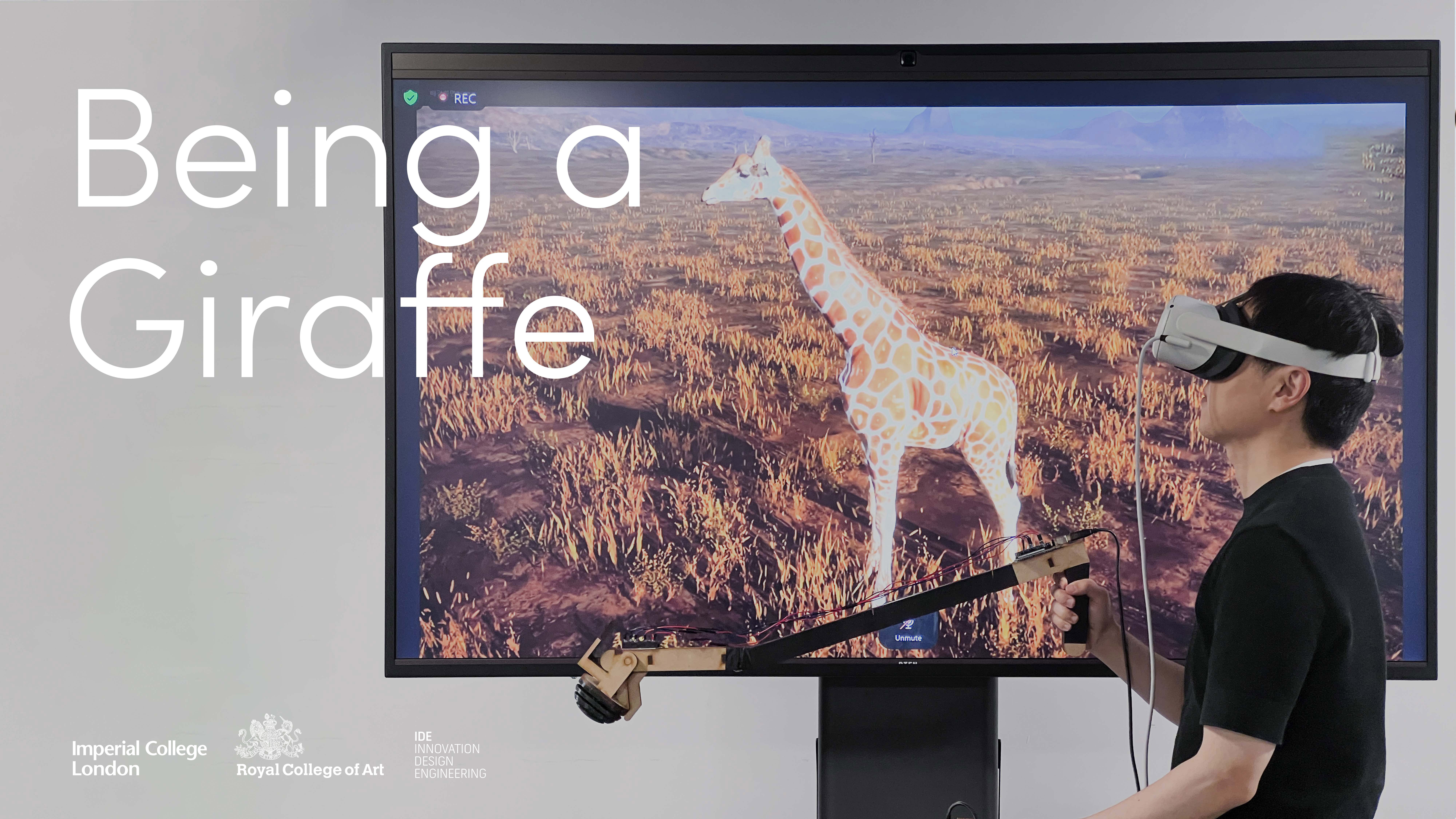 Being a Giraffe integrates advanced VR technology with a physical controller designed to simulate the experience of being a giraffe. The system creates a realistic African savannah environment where users, equipped with VR headsets and a giraffe-like controller, navigate through life-like challenges. These challenges include foraging and interacting with the ecosystem, all designed to provide an immersive, multi-sensory educational experience